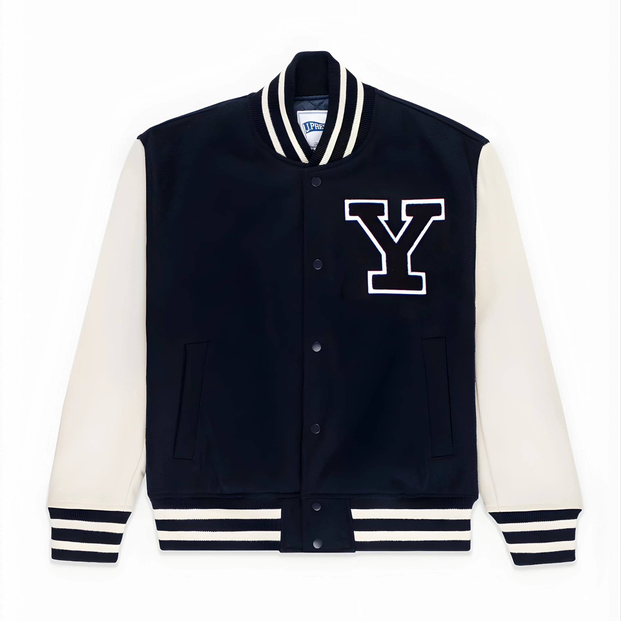 Elevate your casual style with this men’s black and white varsity jacket featuring a bold letter “Y” patch, snap-button closure, and a timeless college baseball look.