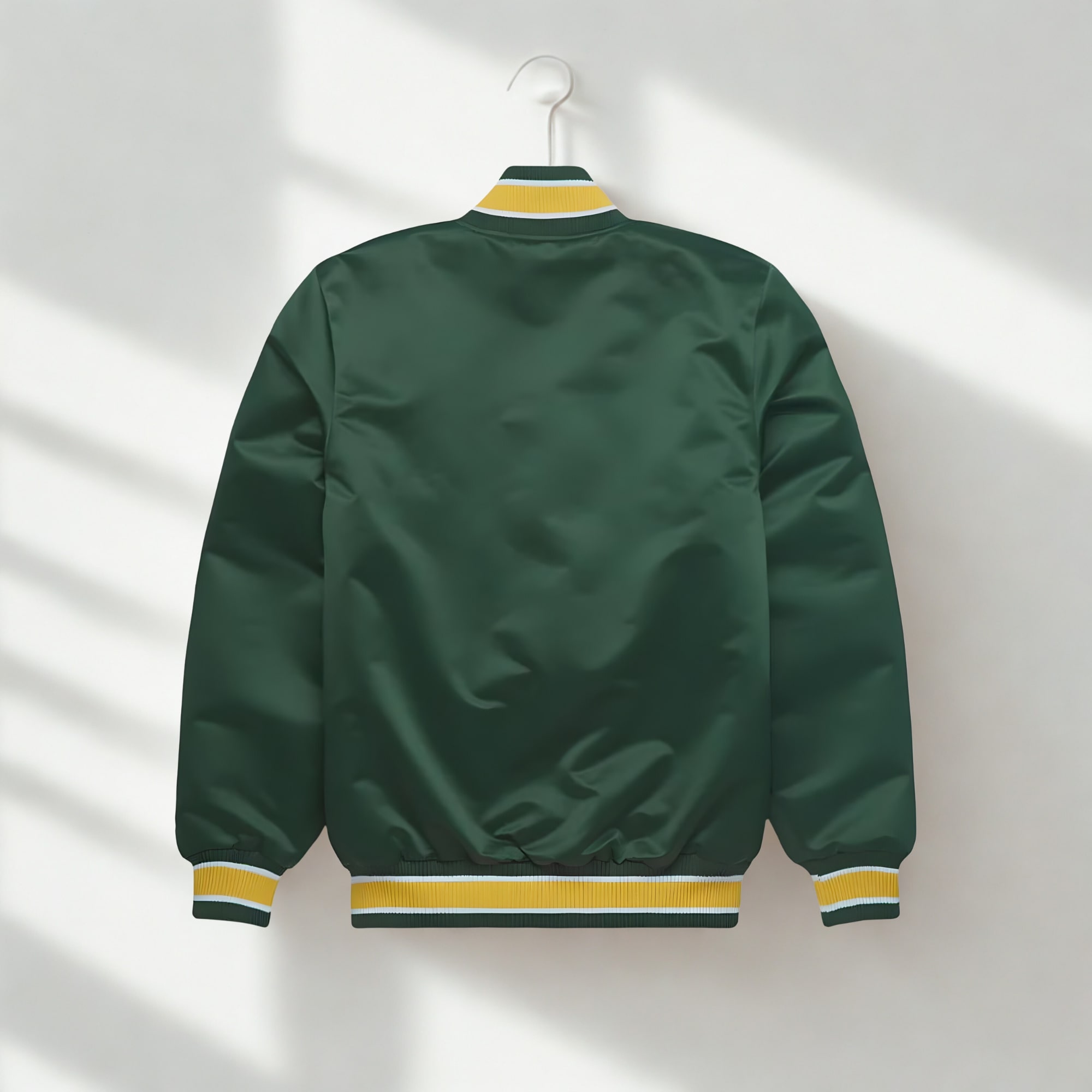 Refresh your outerwear collection with this Men’s Green Satin Varsity Jacket, designed for a timeless sporty and college-inspired look. Made from smooth, high-quality satin fabric, this jacket delivers a sleek finish, lightweight warmth, and all-day comfort. The rich green color paired with yellow and white ribbed detailing adds a bold yet classic varsity appeal.