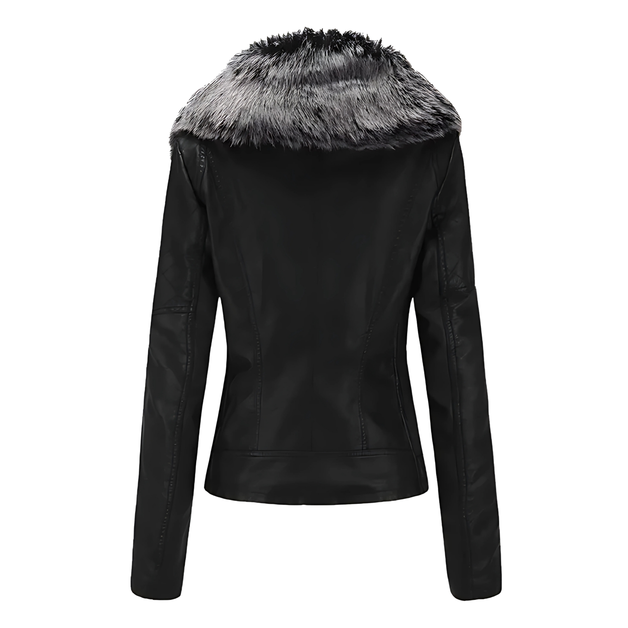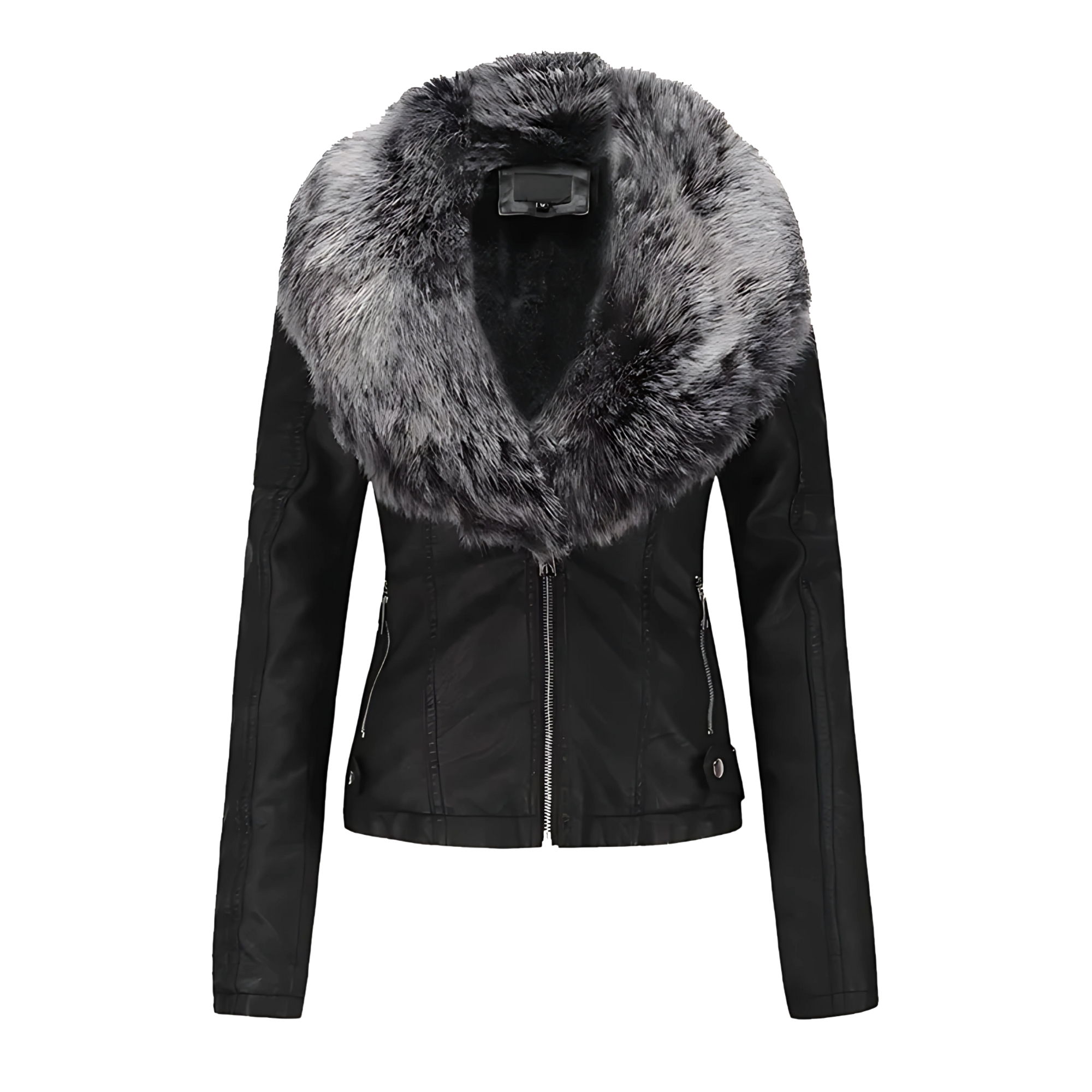 Chic black faux leather jacket for women featuring a plush grey faux fur collar and slim-fit design for a bold, elegant winter look.